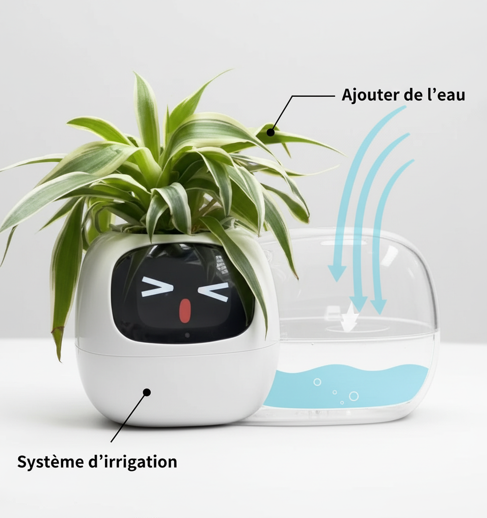 Affichage / Interface : écran (LCD) ou interface visuelle pour montrer l’état, les émotions, le niveau d’eau.